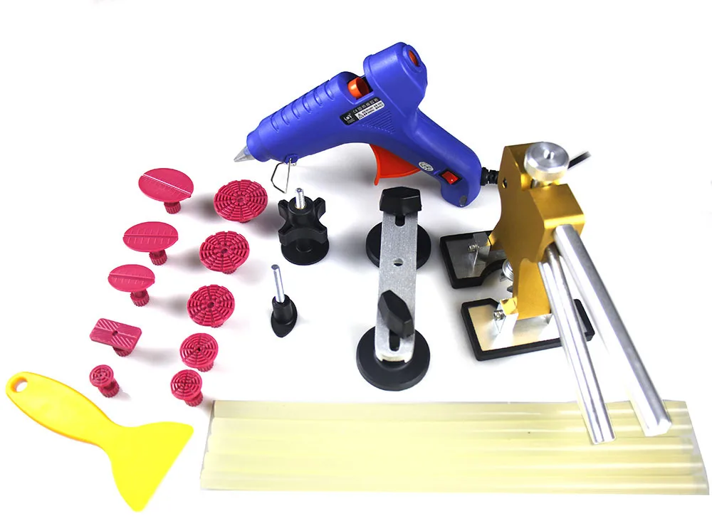 Basic tools to start learning paintless dent removal | PDR Glue Pulling Tools. 1. Glue Gun and PDR Glue. You need to really start taking out small things with glue. Of course you're going to need a glue gun and it doesn't matter if it's a corded one, whether it's battery-powered or gas-powered. You need a glue gun and some PDR glue to start removing dents. 2.