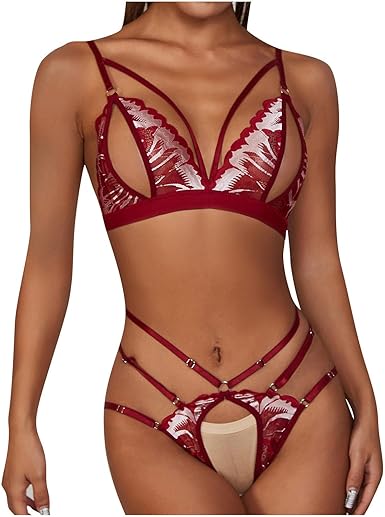 Womens Lace Lingerie Set Sexy Strappy Hollow Bra and Crotchless Panty Embroidery Two Piece Outfits Sleepwear Underwear