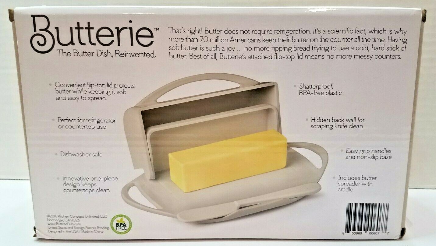 The Best Butter Dish to Buy of 2022: Reviews and price WORLD'S ONLY 1-PIECE BUTTER DISH: Butterie is the only butter dish with an attached flip-top lid. By attaching the lid to the base, the lid never touches your butter or your counter. With this simple design improvement, Butterie solves the slippery mess a traditional 2-piece butter dish makes.